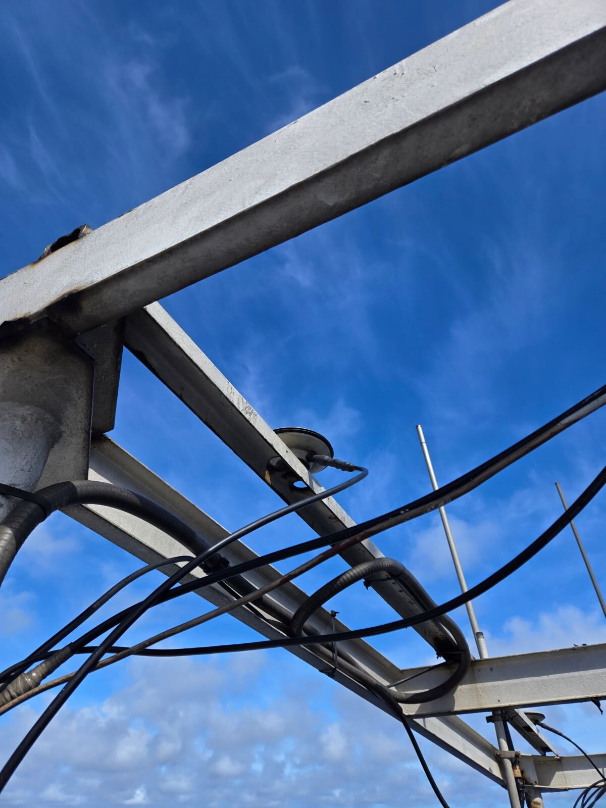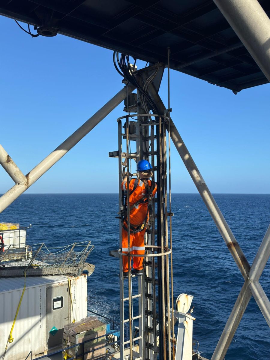 April 30: Worked with marine technician Riley rewiring the seapath receivers; pulled out roblox, fed cable through various parts of the ship, crawled into small spaces. Had to fill out paperwork on bridge for permission to feed wire upwards, geared up, went aloft, adhered cable with metal fasteners.