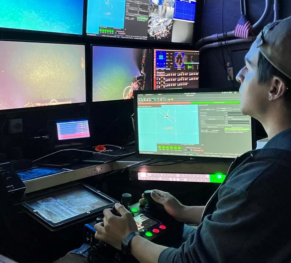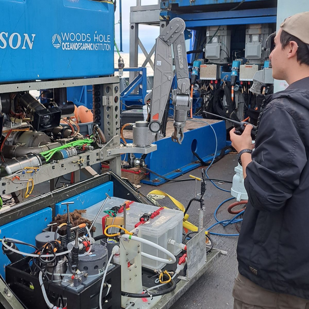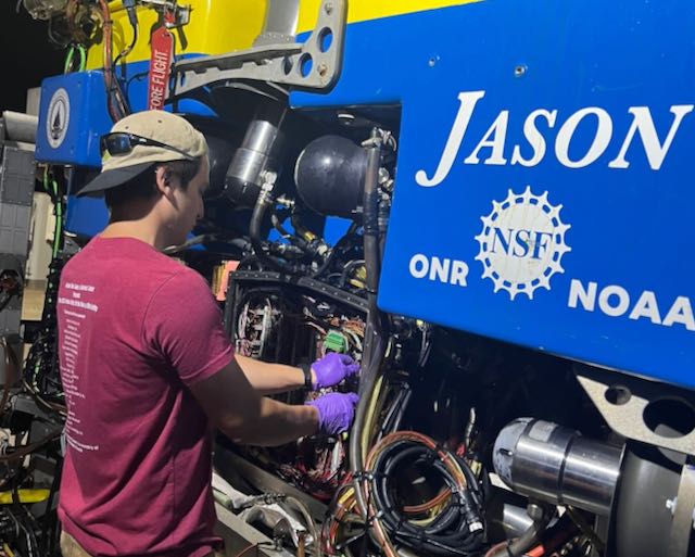 Nearing the end of our shift on Saturday, our crew received a distress call from a nearby MBARI team, who lost their AUV in the thermocline area at approximately 60 meters. It was incredible to see not just our JASON team, but the science members and Thompson’s crew all pitch in to help out. I assisted in concocting a quick, clip-on float that we rigged to JASON’s basket that would be connected one of the AUV’s handles, which would give the vehicle enough positive buoyancy to bring it to the surface. In under one hour, we launched JASON with the float and utilized the AUV’s tracking address (provided by MBARI’s team) with our own Sonardyne system to track the AUV. Within 15 minutes, we had visual of the AUV, grabbed onto it with one of JASON’s manips, while the other manip removed the float from the basket and attached it to the AUV’s handle. The Thompson repositioned itself so it would be clear of both JASON and the AUV upon surfacing, and we were able to release the float, which promptly surfaced the AUV within seconds. I was so very excited and proud to be a part of something like this!
