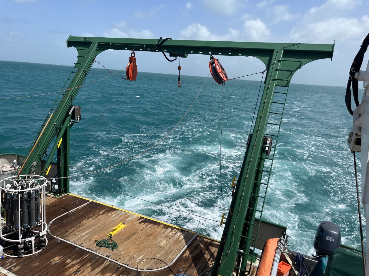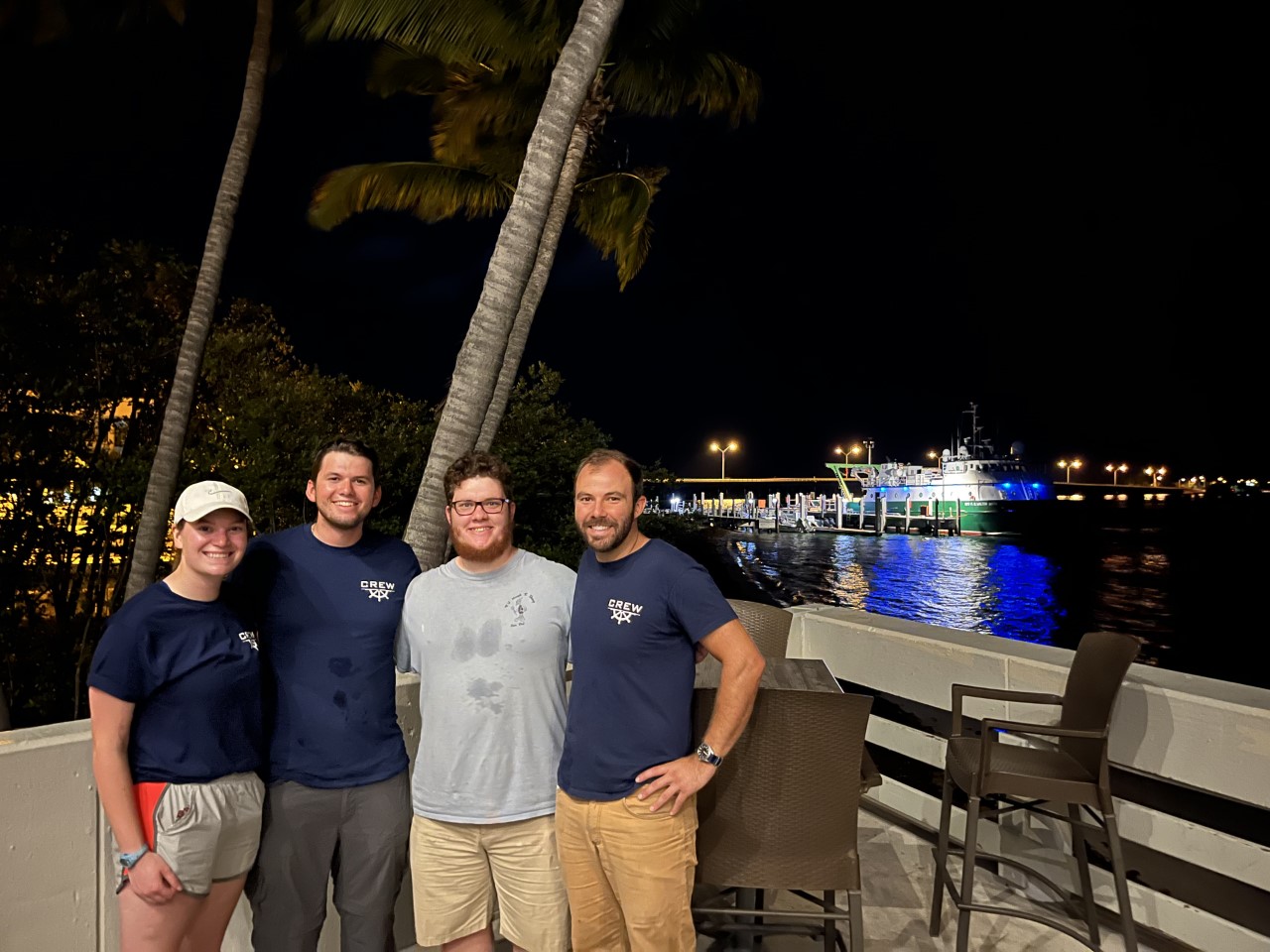 As a tertiary (but also super important) element to this internship I am enjoying the networking and relationships that I am forming with the crew and scientists, as there is a stark contrast from the climate onboard the F.G. Walton Smith research vessel with the tugboats I am used to working on. It is a collaborative, interesting, and thoughtful work environment that is both challenging and rewarding! Everyone shares enthusiasm for the environment, animals, and learning, which promotes everyone to become interested and involved in different areas of research or technical expertise. Here is a picture featuring Alesha Gregroire (left), Jonathan Raymond (Far Right), Sebastian DiGeronimo (Middle Right), and I (Middle Left) all Mate Interns at one point sharing our experiences after the cruise! Below that is a picture of the stern of the R/V F.G. Walton Smith with the CTD connected by the 3-2-2 wire to the starboard side hydraulic winch drum.